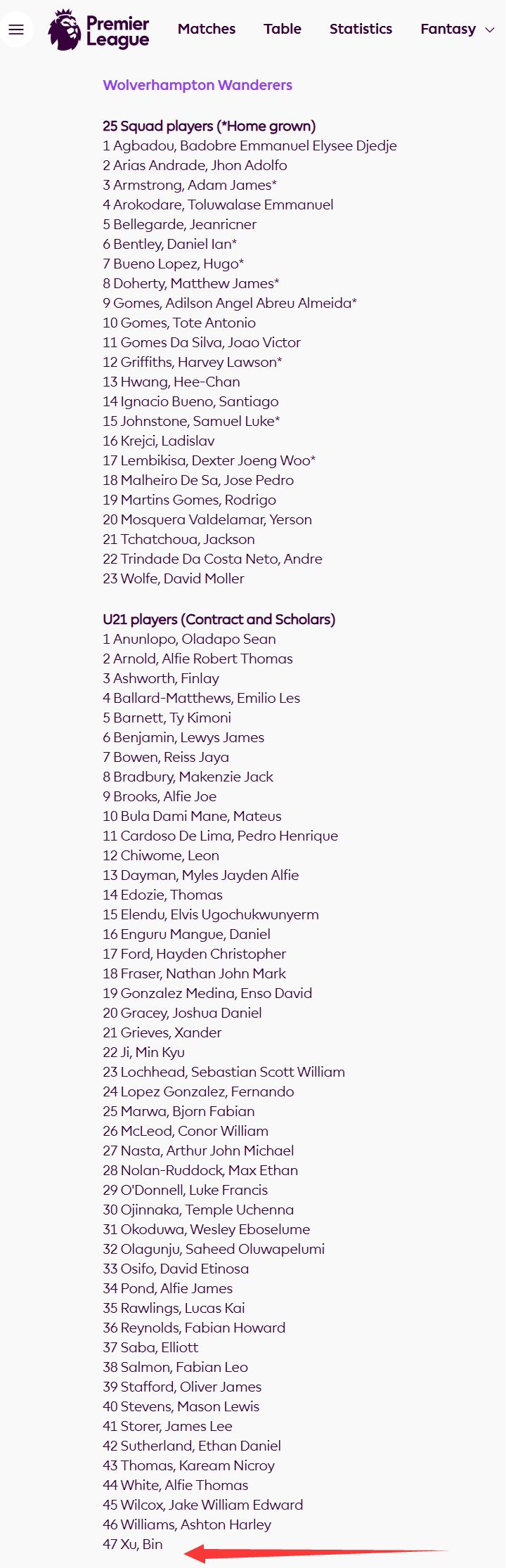 电竞世界杯-加油!英超官网冬窗更新名单:徐彬的名字出现在狼队U21球员一列
