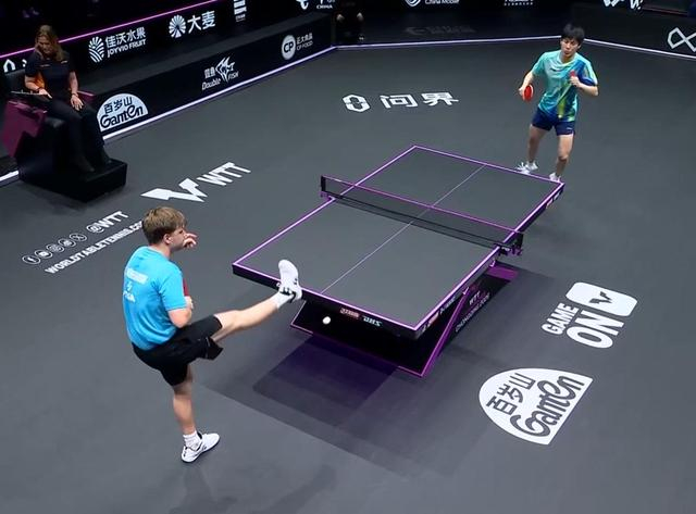 此后的比赛,彻底进入了中国小将的节奏。第三局,双方比分交替上升,多次战平。在6-5领先的关键时刻,温瑞博果断请求暂停,刘恒指导的部署立竿见影。暂停归来,温瑞博坚持主动劈长打相持的策略,彻底锁死了莫雷加德的搏杀空间,连得分数以11-7再下一城,大比分2-1反超。正是这一局的失利,让素有“北欧鲁莽人”之称的莫雷加德彻底失控。转播镜头清晰地捕捉到,对自己表现极度不满的瑞典人,竟抬腿猛踢比赛用球泄愤!