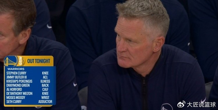 本场库里(膝伤)、巴特勒(报销)、波神(生病)、追梦(背伤)、霍福德(小腿伤)、梅尔顿(膝伤)、穆迪(手腕伤)、赛斯库里(内收肌伤)悉数缺席。